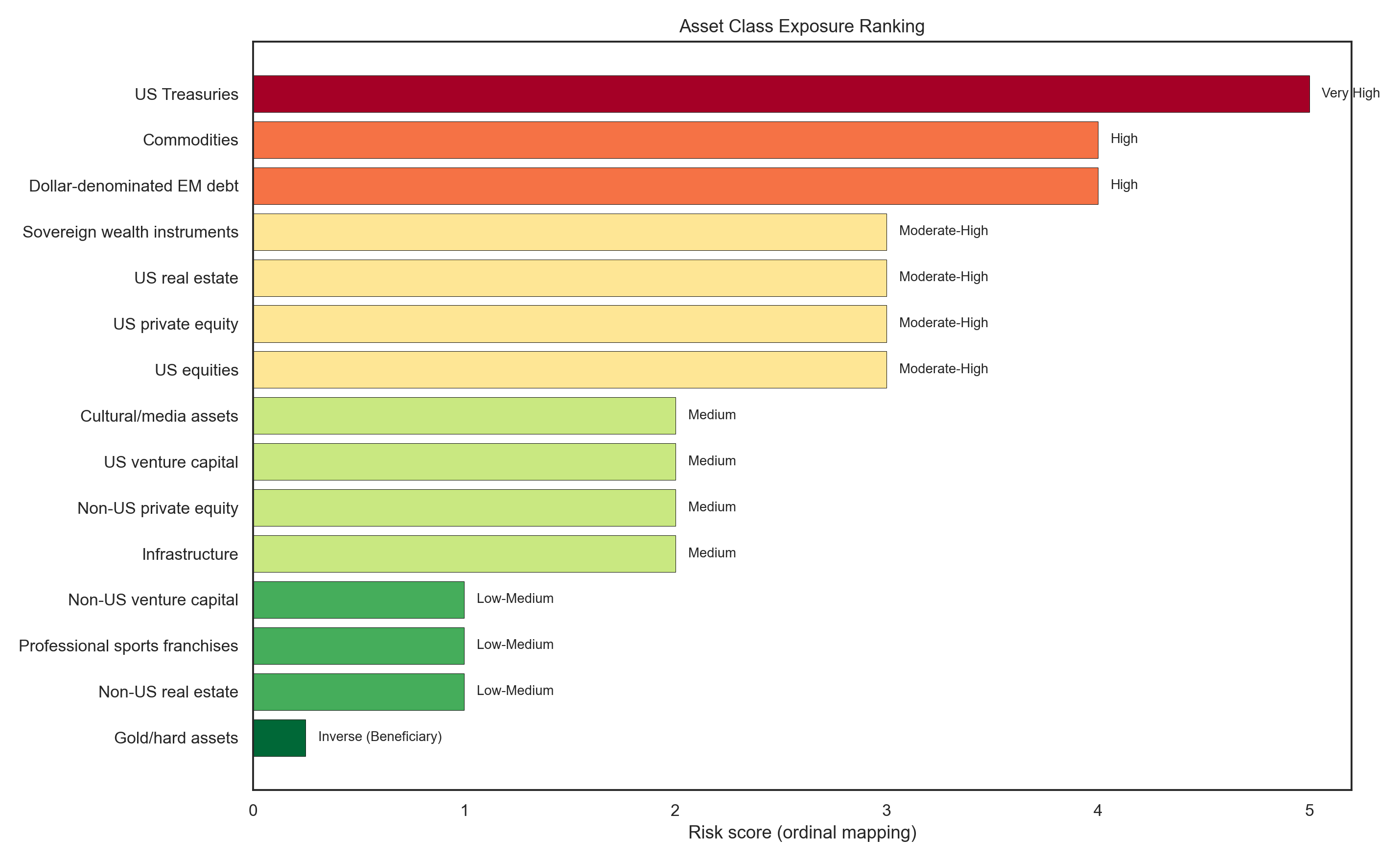 Asset-class exposure ranking. The US balance sheet is vulnerable not only where the dollar is explicit, but where Treasury pricing quietly sets the floor under everything else.