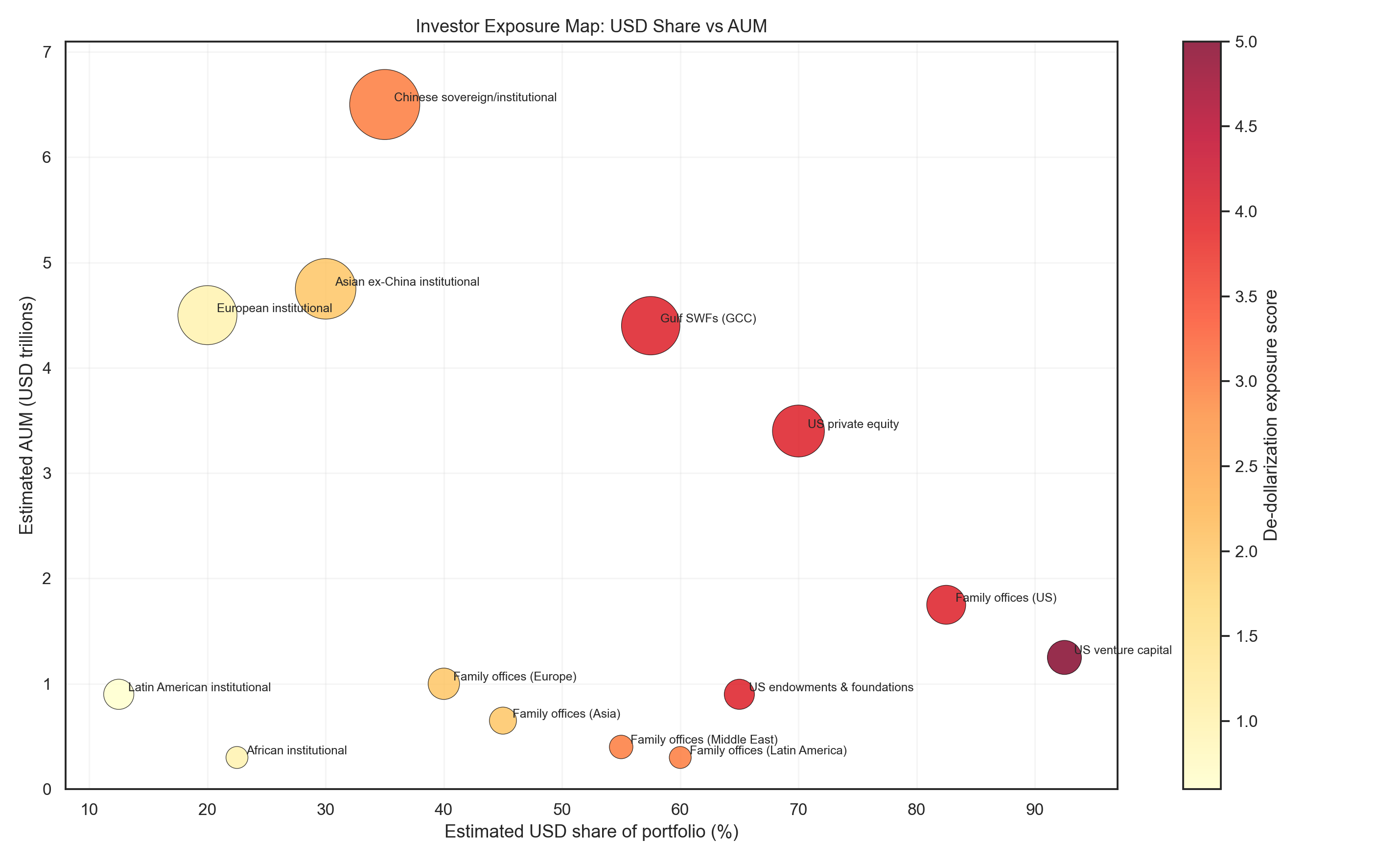 Investor exposure by AUM and USD share. Gulf SWFs matter not because they are the only exposed actors, but because they are large enough to turn political realignment into market structure.